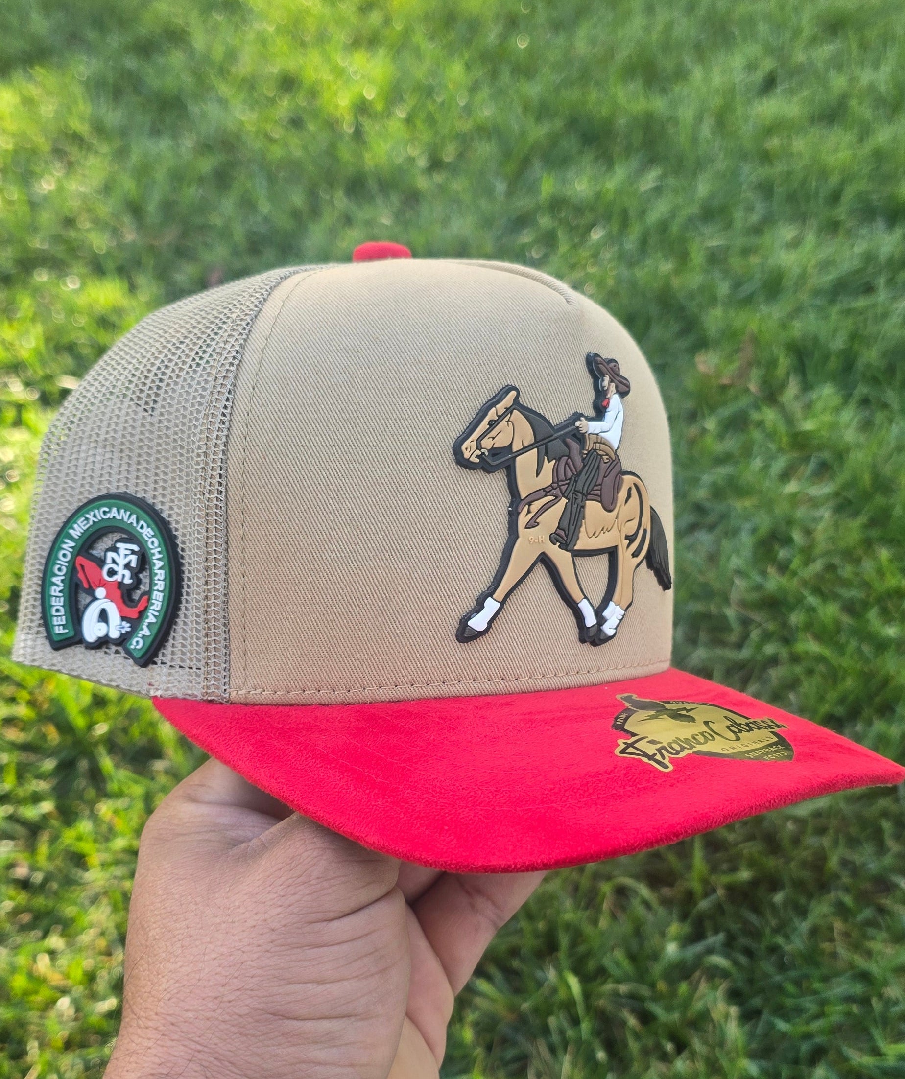 Cala de caballo con placa frontal de goma bisera de gamuza, lateral derecho federacion mexicana de charreria,lateral izquierdo pin del terre hats.