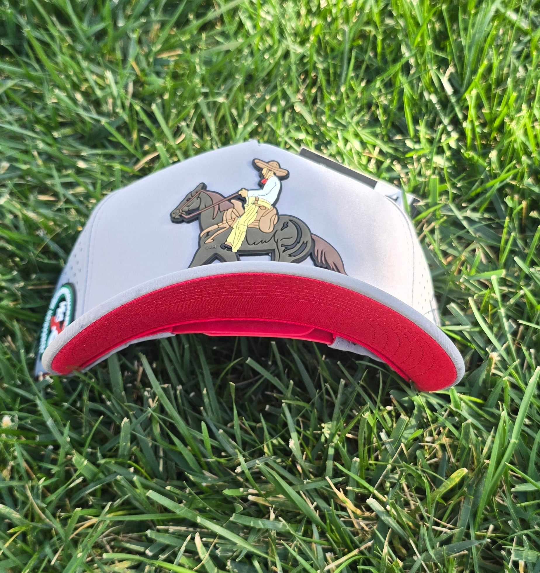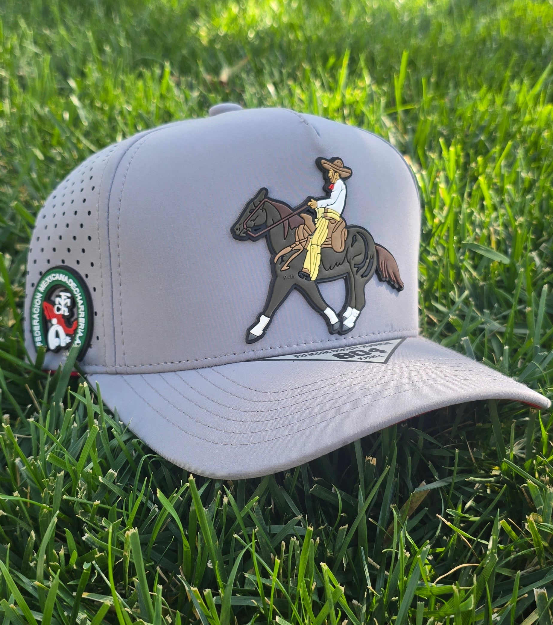 Cala de caballo frontal con placa de goma, lateral de goma federacion mexicana de charreria,lateral izquierdo pin del terre hats.