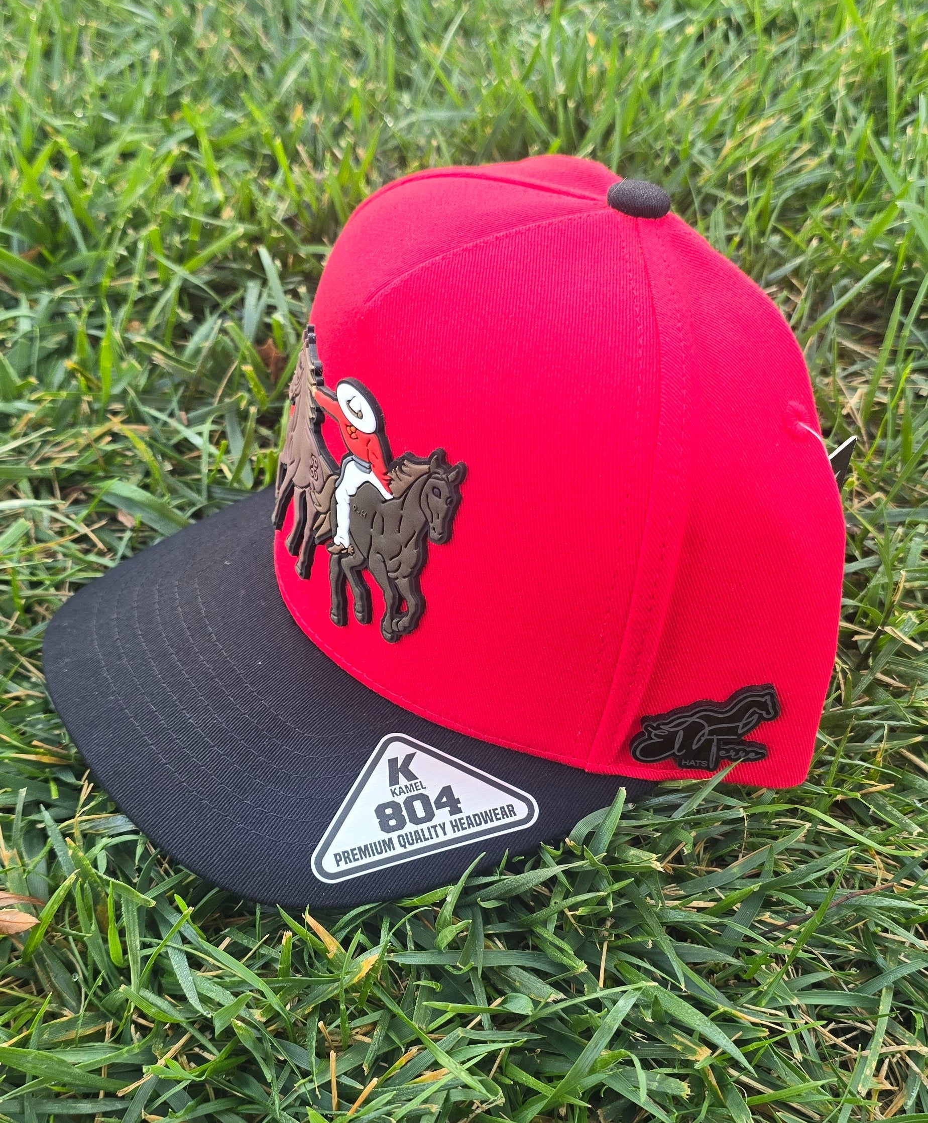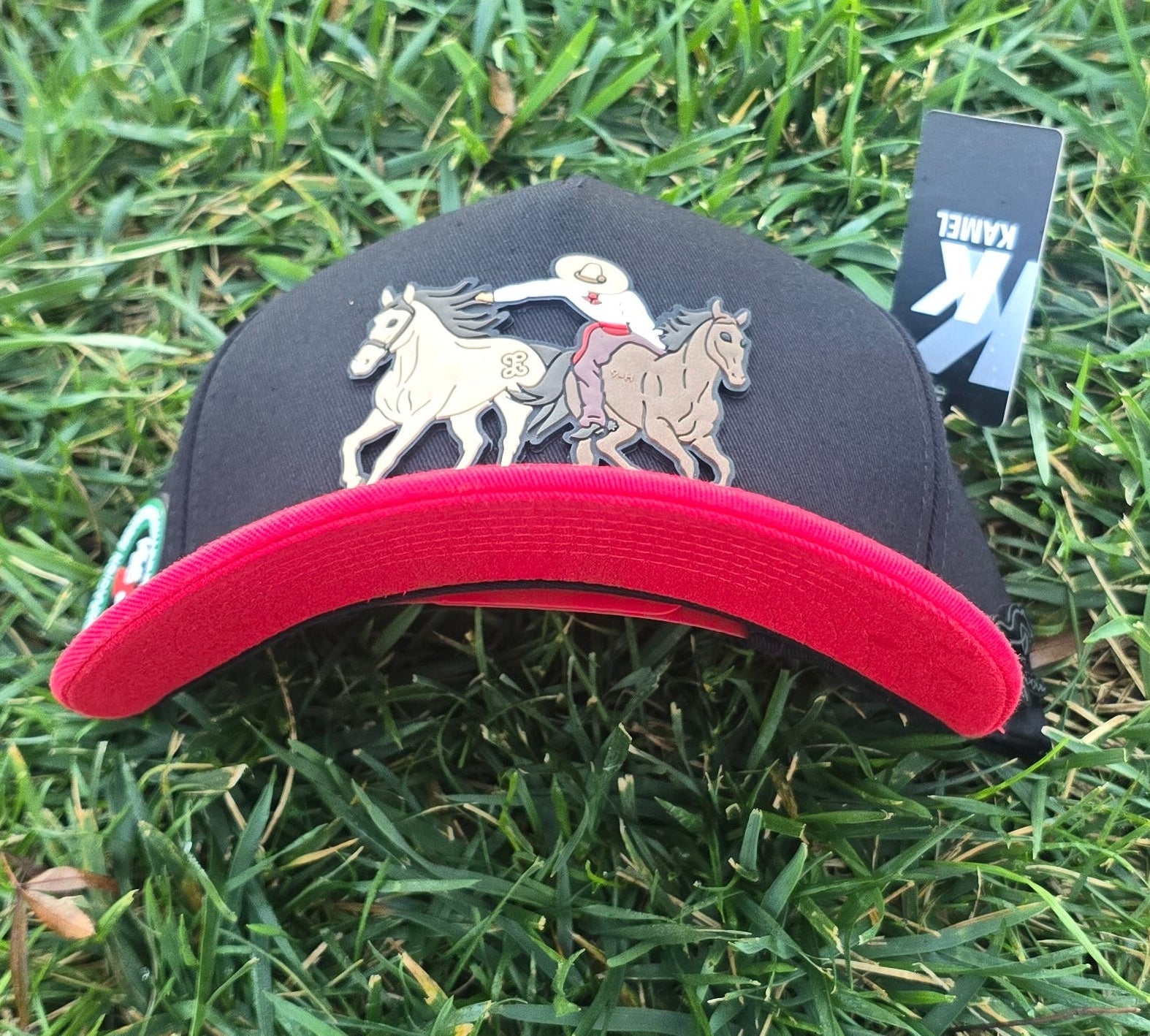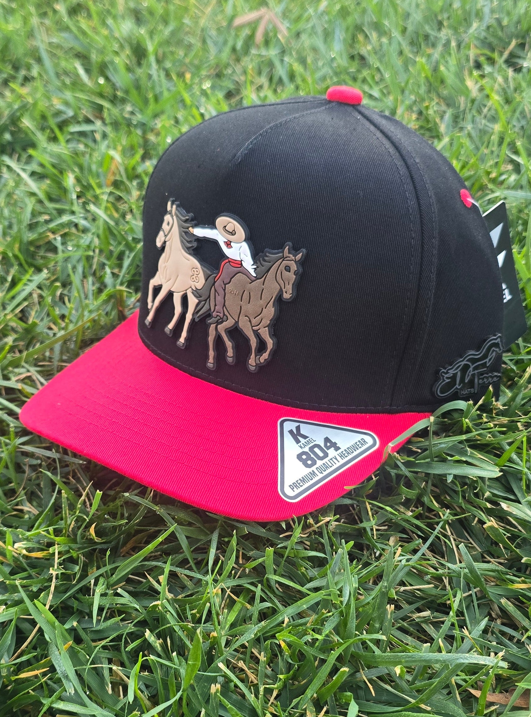 Paso De la Muerte en goma frontal,federacion mexicana de charreria al lado derecho en goma, lateral izquierdo Pin del terre hats